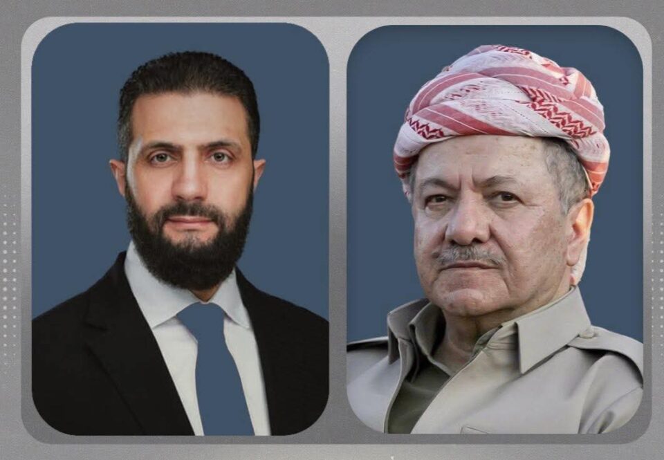 د ڕاگەهاندنەکێ دا بارەگەهێ بارزانی بەلاڤکرییە؛ ل ئێڤارییا ڕۆژا سێ شەمبوویێ 20ی كانوونا دووێ 2026 سەرۆك مەسعود بارزانی، پەیوەندییەكا تێلەفۆنی یا ئەحمەد شەرع سەرۆكێ سووریا پێ گەهشت.