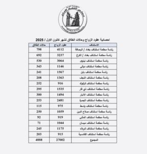 أعلن مجلس القضاء الأعلى في العراق، اليوم الاثنين، إحصائية عقود الزواج وحالات الطلاق المسجلة خلال شهر كانون الأول/ديسمبر من عام 2025، مشيراً إلى تسجيل أكثر من 27 ألف عقد زواج مقابل 4 آلاف و888 حالة طلاق في عموم العراق، باستثناء إقليم كوردستان.
