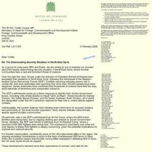 وجّه أكثر من 70 عضواً في البرلمان البريطاني (مجلسي العموم واللوردات) من مختلف الأحزاب، بما فيها حزب العمال الحاكم وحزب المحافظين المعارض الرئيسي، رسالةً إلى وزيرة الخارجية البريطانية إيفيت كوبر، حذروا فيها من الخطر الحقيقي والوشيك للعنف الذي يواجه الشعب الكوردي في روج آفا.