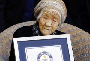 ژنێكى ژاپۆنى به ناوى كین تاناكا كه به بهتهمهنترین كهس دادهنرێت له گۆیى زهوى و بوو به 117 ساڵ له ئاههنگى له دایكبوونى تامى كێكهكهى دهكات و دهڵێ “زیاترم پێ بدهن”.