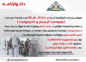 li gorey bizav û çalakiyên Desteya Bilinda Bingehê Laliş ji bo li darxistina dîdarên taybet bi rewşa Êzidyan ve li roja pênçşenbuyê wê dîdara xwe ya pêncem li rêkeftî12\1\2023 li demjimêr 2:30 piştî nîvro bi amade buna her yek ji (D.Muhemed Ihsan wezîrê mafê mirovî yê berê û D. Dîndar Zêbarî rêkxerê raspardên nîvdewletî li Hikûmeta Herêma Kurdistanê Û Hisen Qasim Hesûn rawêjkarê serokê herêma Kurdistanê) li ser mijara (Cênûsayda Êzidiyan û Dadperwerî) li dar bixe .