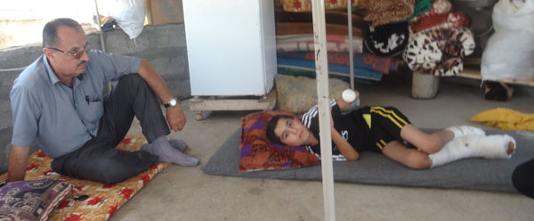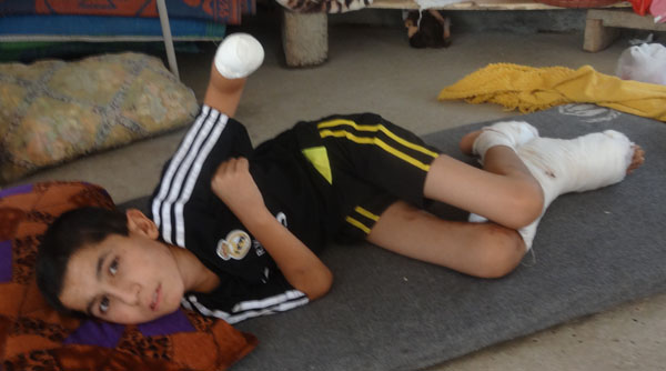 زرت اليوم الخميس 23-7-2015 الجريح ( ايمن فاروق بكر/ عمره 12 سنة) في مخيم خانك/ قاطع f خيمة 17، وقد فقد كف يده اليسرى وكسر في القدمين مع وجود العديد من الشظايا في جسمه نتيجة انفجار لغم في منطقة (سردشت) في الجبل، دعواتنا من الرب أن يشفى بأسرع وقت ممكن.
