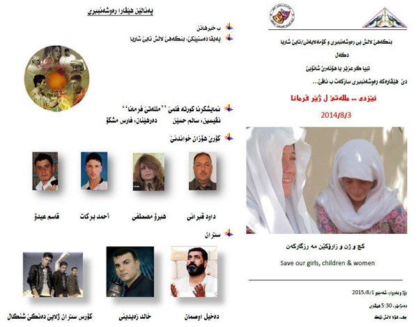 تحت شعار” الايزيدية… في ظل الابادة الجماعية” أقام مركز لالش الثقافي و الاجتماعي فرع شاريا و بالتنسيق من فرقة كرعزير لفنون المسرحية أمسية ثقافية و فنية في يوم السبت 1/8/2015 و ذلك على قاعة لالش في شاريا، تضمنت هذه الامسية فقرات فنية و أدبية عديدة، و بحضور جمع غفير من الجماهير حيث أعتذر منظمي النشاط عن عدم قدرة القاعة لأستيعاب كل الموجودين، بدأت فعاليات الامسية بالوقوف دقيقة صمت على أرواح شهداء الابرياء و على ارواح الابطال الذين ضحوا بدمائهم الزكية، تلى ذلك كلمة القائها السيد جلال لزكين بهذه المناسبة الاليمة رحب بالحضور الكرام كل من السيد شيخ شامو رئيس الهيئة العليا لمركز لالش و السيد اشتى كوجر قائد قوات البيشمركة في جبل شنكال و كذلك السادة قائمقام قضاء شنكال ميسر حجي و السيد دخيل قاسم حسون أعضاء الفرع السابع عشر للحزب الديمقراطي الكوردستاني. و أكد السيد جلال لازكين مطالبته الحكومة العراقية بالموافقة على طلب العضوية و الانضمام إلى المحكمة الجنايات الدولية، كما طالب كل من البرلمان العراقي و برلمان أقليم كوردستان بالمزيد من الضغط على الحكومتين لأخذ التدابير و الاجراءات الاكثر تنظيماً من أجل التعريف بالابادة الجماعية لكارثة شنكال. كما طالب المنظمات الدولة و المحلية بالمزيد من الدعم و العمل من أجل النازحين الذين مر على نزوحهم سنة كاملة.