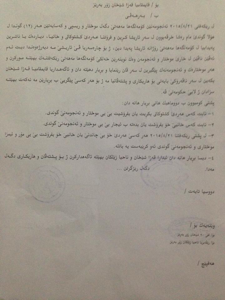 في يوم الجمعة الموافق 21 اب 2015 وعلى قاعة مام رشان اجتمع الهيئة الاختيارية ووجهاء ومختاري قرى مجمع مهد للتباحث حول تشكيل لجنة مهمتها منع بيع العقارات والاراضي الزراعية الى الغرباء الا بموافقة هذه اللجنة وتم ابلاغ السلطات الحكومية في قضاء الشيخان بكتاب رسمي لهذا الغرض حيث اكد المجتمعون على منع بيع اي ملك او اراضي زراعية دون موافقة هذه اللجنة وحول مهمة هذه اللجنة تحدث الينا خلات بير الياس احد اعضاء هذه اللجنة قائلا:مهمة اللجنة هو لمنع ظاهرة بيع الاراضي الزراعية وبيوت السكن للناس الغرباء وخاصة ان هناك اشخاص كانوا ينون بيع بيوتهم الى اشخاص ليسوا من المنطقة ومن غير دول وسيتم تغيير البنية الديموغرافية للمنطقة، واكد بير خلات ان اي شخص يقوم بشراء اي عقار دون علم وموافقة هذه اللجنة سيكون مرفوضا.