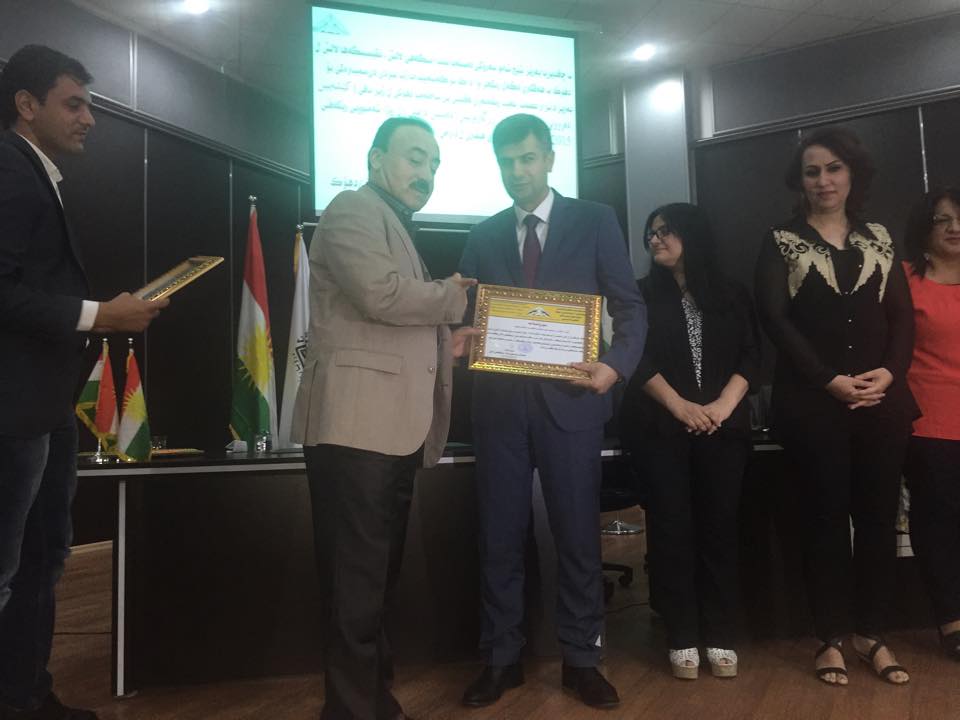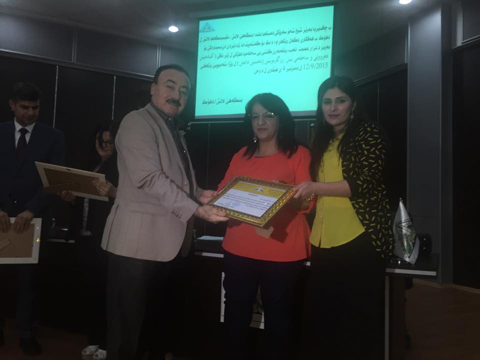 في ختام المحاضرة تم تكريم كل من الدكتور نزار والدكتورة نغم والدكتورة لمى من قبل الشيخ شامو رئيس الهيئة العليا لمركز لالش تثمينا لجهودهم كلجنة مختصة تابعة لرئاسة صحة دهوك لمعالجة الناجيات الايزيديات من الناحيتين النفسية والجسدية.