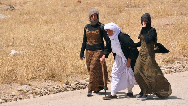 ويعتبر تنظيم داعش الايزيديين كفارا. ويقدر عددهم بنحو نصف مليون شخص ويعيشون بعد تشريدهم في مخيمات في إقليم كردستان العراق شبه المستقل.