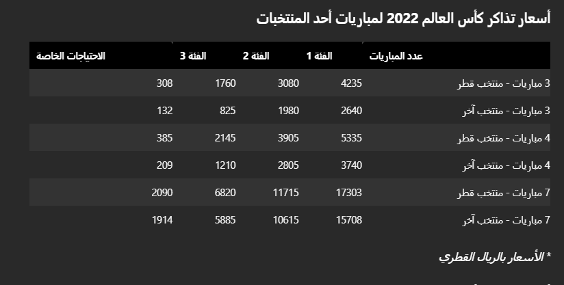 أما بالنسبة للمباريات الأخرى في دور المجموعات، يمكن للمقيمين القطريين شراء تذاكر مقابل 40 ريالا قطريا (11 دولارا أمريكيا)، وهو أرخص سعر بالنسبة للسكان المحليين منذ كأس العالم 1986 في المكسيك.