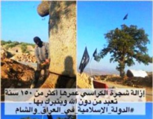 وكتب هذا المصدر الخميس على حسابه في تويتر “دعوتنا جهادنا” إنه “بحمد الله تعالى، تمت إزالة شجرة الكراسي التي عمرها أكثر من 150 سنة، وتعبد دون الله ويتبرك بها”. ونشرت صور يبدو فيها رجل يلبس قناعًا أسود، ويحمل بيده منشارًا، على الشبكة الاجتماعية أيضًا. وفي أعلى الشجرة، يظهر علم أسود يذكر بأعلام “القاعدة”.