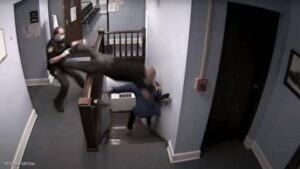 وخلال وصوله إلى الدرج، حاول شرطي القفز بطريقة انتحارية على الهارب لقطع الطريق عليه، لكنه فشل في عمليته وتدحرج على درجات السلم وبدا أنه غير قادر على التحرك.