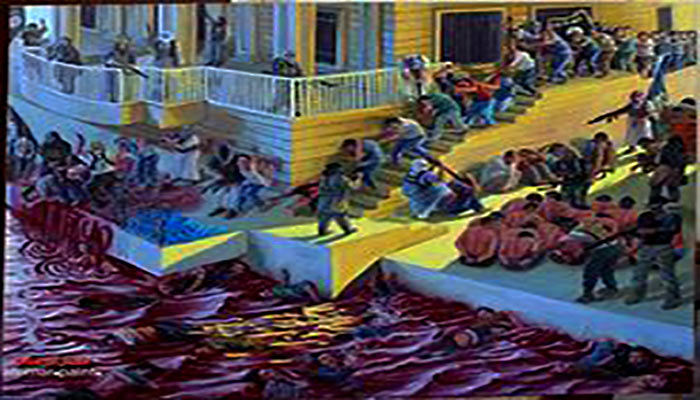 وتابع “سالم” أن جريمة سبايكر كانت مركبة كما تجسدها اللوحة أي أنها تكونت من سلسة جرائم تبدأ بالضرب والإهانة والتنكيل والتعذيب الجسدي والنفسي ومن ثم لا تنتهي بالقتل والذبح وإنما تمتد إلى التمثيل بجثث الضحايا وإسالة دمائهم على هيأة نهر.