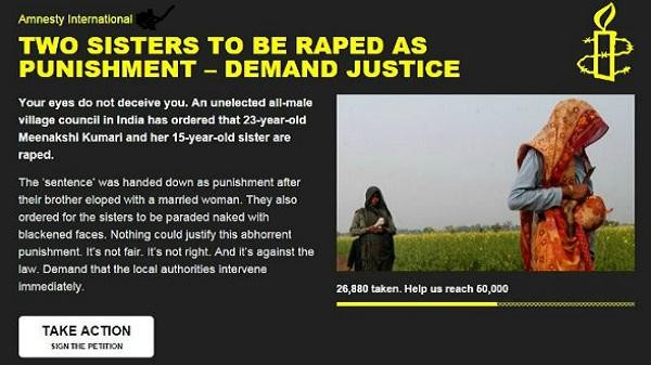 قالت “العفو الدولية” في بقية التفاصيل ان أفراد عائلة الهارب مع المرأة، وهم الأب وابنتيه المحكوم عليهما بالاغتصاب العلني، فروا الأسبوع الماضي من قرية Baghpat الواقعة في متاهات ولاية “أوتّر بريداش” الريفية، الى العاصمة الهندية نيودلهي المجاورة، مستغيثين بالسلطات بعد صدور الحكم القروي المحلي، وطالبين الحماية.