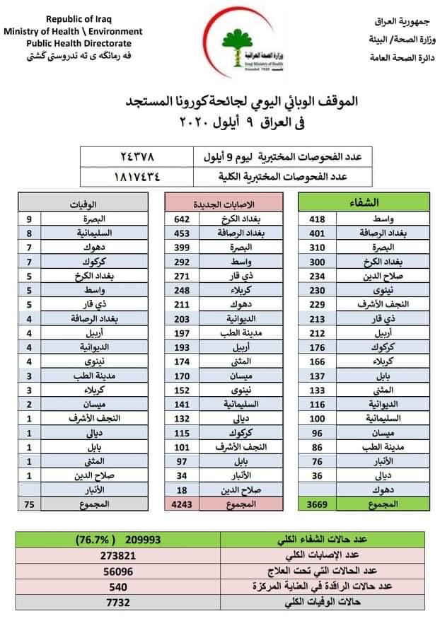 وتضمن الموقف الوبائي ان “عدد الاصابات بالفايروس 4243 اصابة وحالات الشفاء بلغت 3669”.