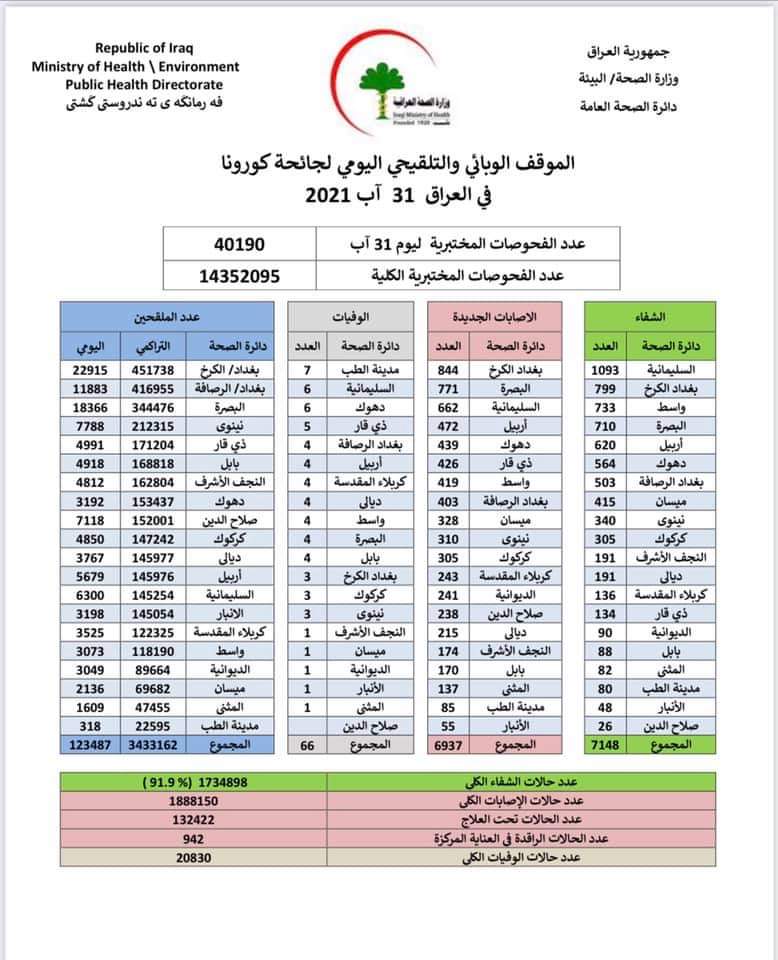 وأضاف البيان، أن “حالات الوفاة الجديدة بكورونا بلغت 66 حالة في عموم محافظات البلاد”، لافتا إلى أن “الاشخاص الذين تلقوا اللقاح خلال 24 ساعة بلغ عددهم 123487”.