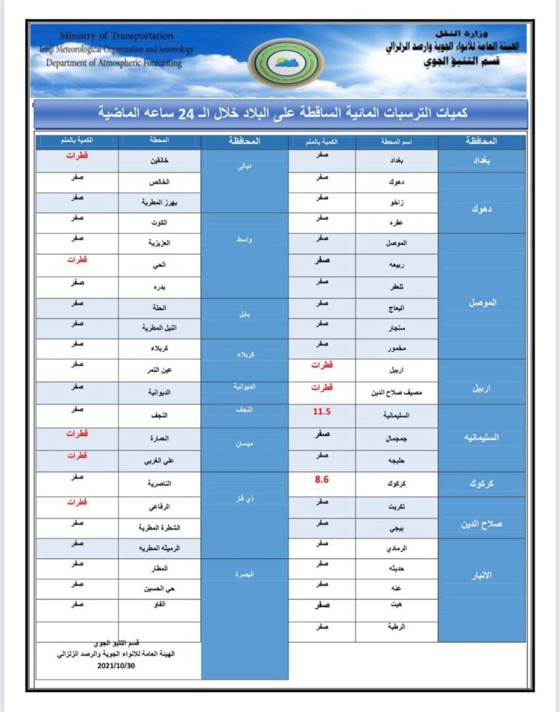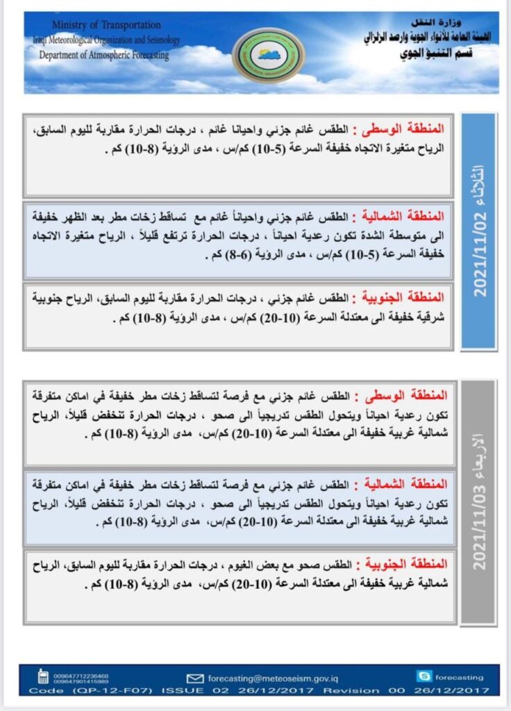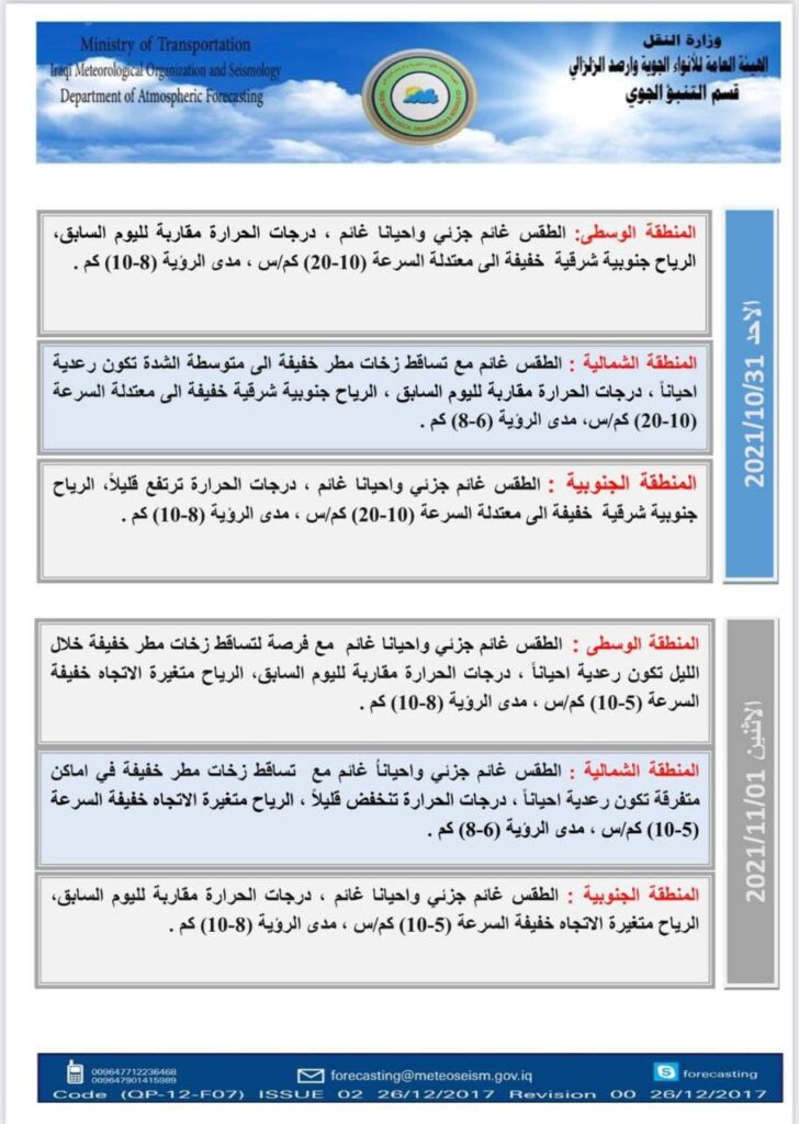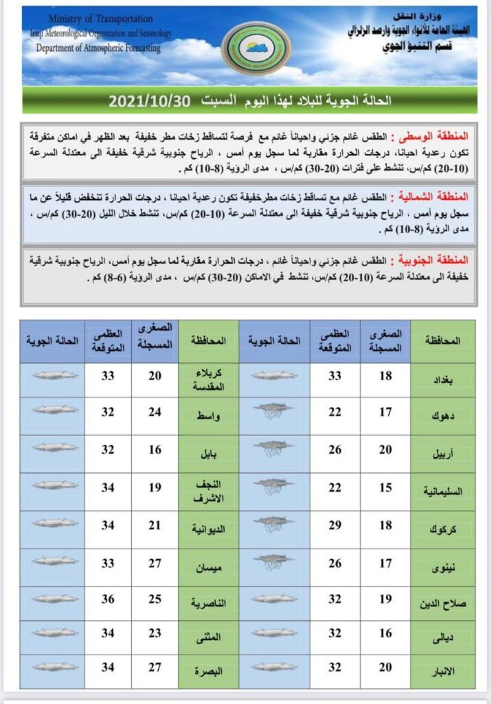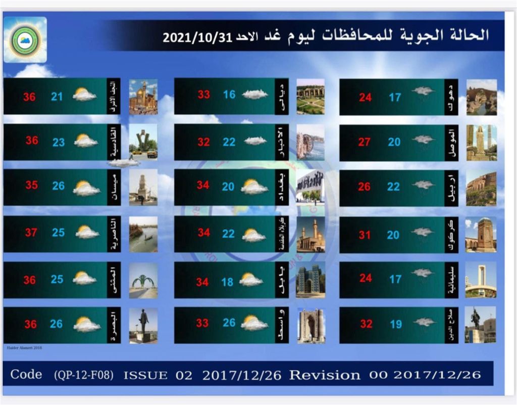 وذكر بيان للهيئة، أن “طقس يوم الأحد في الأقسام الوسطى والجنوبية من البلاد سيكون غائماً إلى غائم جزئي، في حين سيكون الطقس غائماً مع فرصة لتساقط أمطار خفيفة إلى متوسطة الشدة تكون رعدية أحياناً، أما درجات الحرارة فمقاربة لليوم السابق في الأقسام الشمالية والوسطى، بينما سترتفع درجات الحرارة قليلاً في القسم الجنوبي من البلاد وستكون درجة الحرارة في بغداد 34 مئوية وفي السليمانية 24 وفي ذي قار 37 مئوية”.