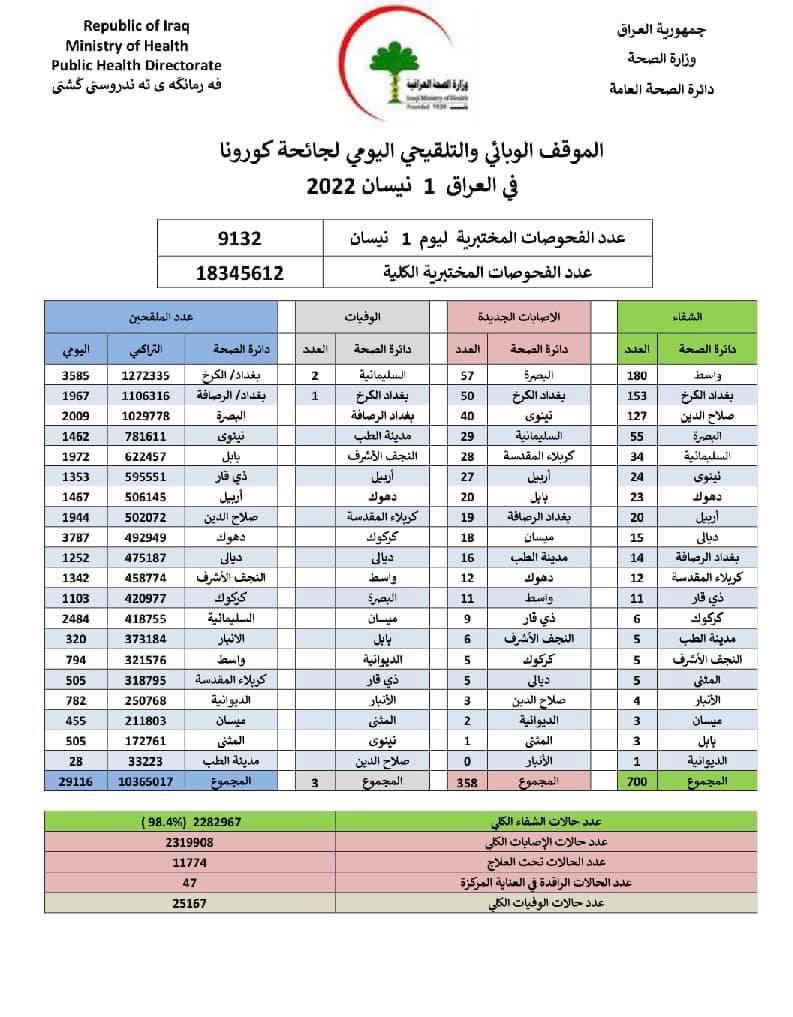 وذكرت الوزارة في بيان صادر عنها، الجمعة (1 نيسان 2022)، أنها سجلت 358 إصابة جديدة بفيروس كورونا في العراق، ليصبح العدد الكلي للمصابين بالفيروس 2319908 اشخاص.