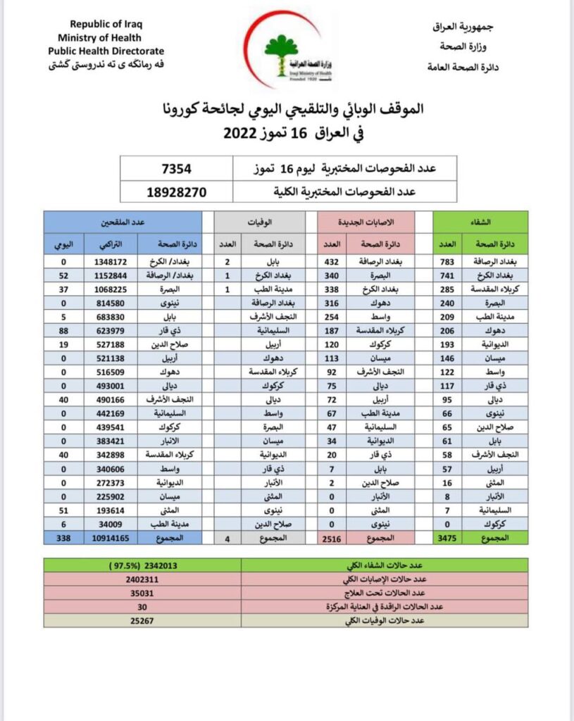 اعلنت وزارة الصحة والبيئة العراقية، اليوم السبت، تسجيل 2516 اصابة بـ وباء كورونا و 3475 حالة شفاء، فيما سجلت 4 حالات وفاة جديدة خلال الساعات الـ24 الماضية.