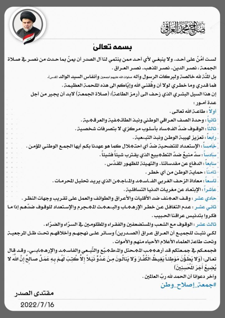 أصدر زعيم التيار الصدري مقتدى الصدر، السبت، توجيهات جديدة إلى أنصاره إثر نصر صلاة الجمعة الموحدة في بغداد.