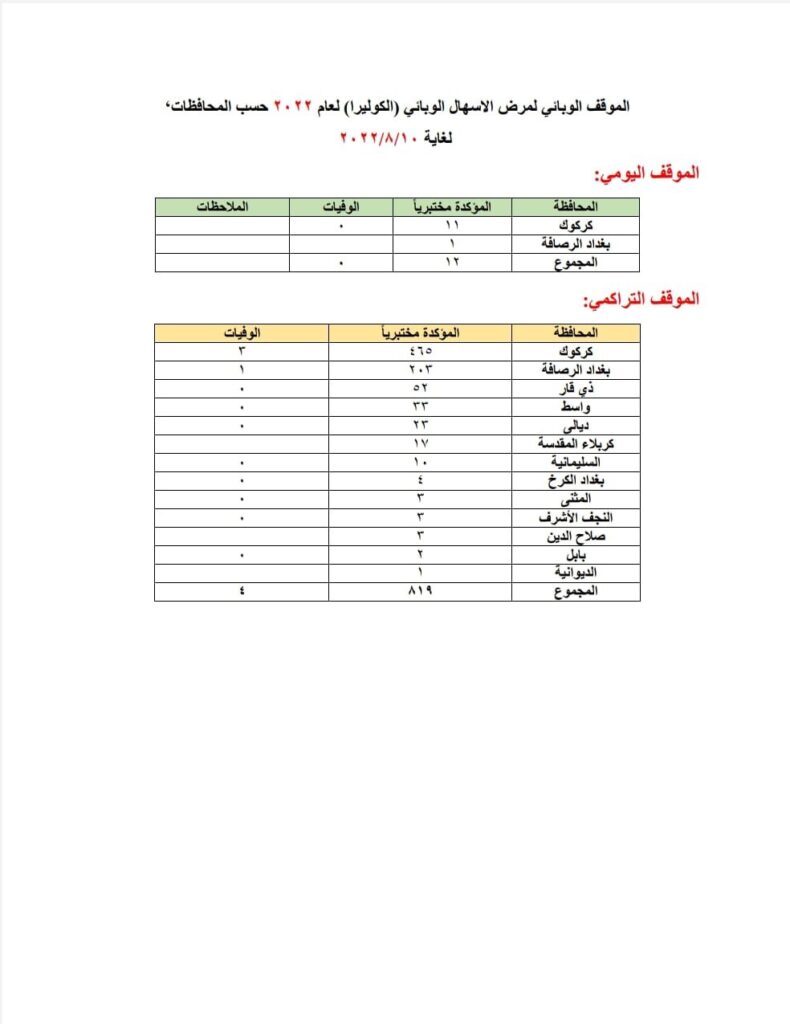 واضاف أن “الموقف الوبائي لمرضى الكوليرا في العراق منذ بداية العام لغاية الـ10 من آب الحالي هو: