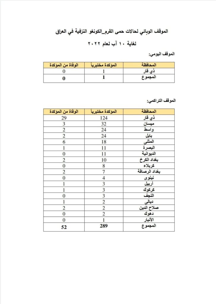 وقال المتحدث باسم الوزارة سيف البدر، إن “الموقف الوبائي للحمى النزفية في العراق منذ بداية العام لغاية الـ10 من آب الحالي كالآتي: