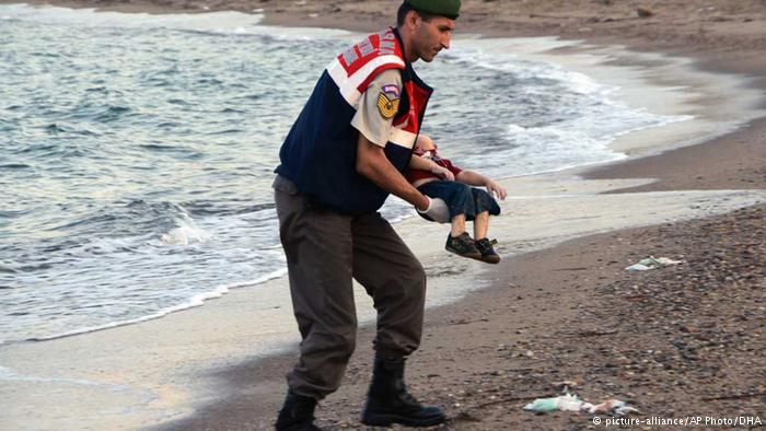 الصورة تظهر طفلا صغيرا لم يتجاوز الثالثة من عمره يرتدي قميصا أحمرا وسروالا قصيرا أزرق اللون وهو ملقى على بطنه ووجهه في الرمال وسط رغوة الأمواج المتكسرة على شاطئ يقع قرب مدينة بودروم التركية السياحية. وفي صورة ثانية بدا رجل شرطة تركي مقطب الوجه يحمل الجثة الصغيرة على ذراعيه ويشيح بنظراته عن الطفل وكأنه يخشى ألا يتملك نفسه عند رؤية هذا الصبي الصغير. يأتي ذلك بعد تناقل وسائل الإعلام خبر وفاة 12 شخصا يفترض أنهم لاجئون سوريون أثناء محاولتهم الوصول إلى جزيرة كوس اليونانية.