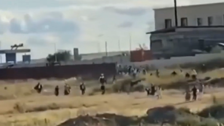 ورصد مقطع فيديو الضيوف في فساتين وبدلات السهرة وهم يبتعدون هاربين في منطقة مفتوحة وخالية، بعد خروجهم من مطعم بمدينة تميرتاو في كازاحستان.